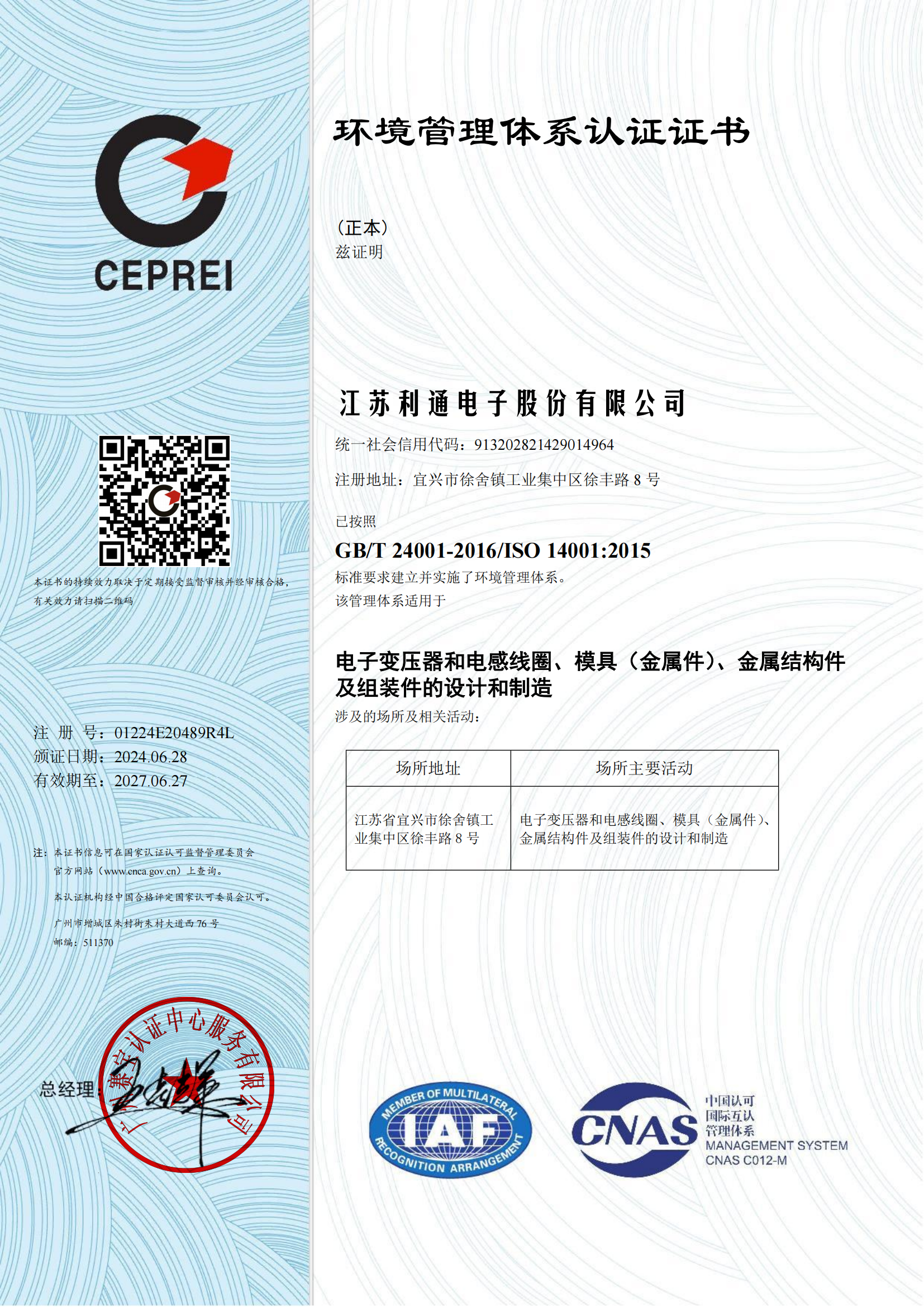 ISO 14001 环境管理体系认证证书
